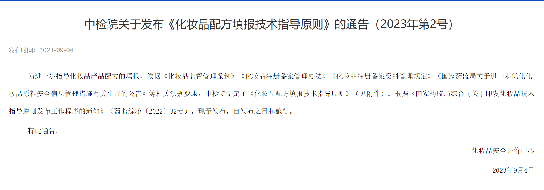 中检院发布《化妆品配方填报技术指导原则》