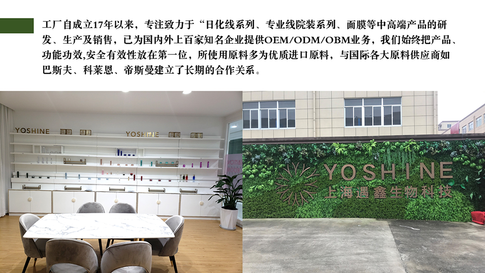 工厂自成立15年以来,专注致力于“日化线系列、专业线院装系列、面膜等中高端产品的研发、生产及销售,已为国内外上百家知名企业提供OEM/ODM/OBM业务,我们始终把产品、功能功效,安全有效性放在第--位,所使用原料多为优质进口原料,与国际各大原料供应商如巴斯夫、科莱恩、帝斯曼建立了长期的合作关系。