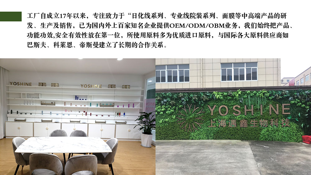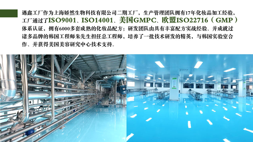 上海遇鑫生物科技有限公司是专业生产国内外高端护肤、洗涤类的化妆品加工OEM/ODM专业供应商,专业从事化妆品加工生产研发15年。上海遇鑫米兰手机在线官网占地30亩,建筑面积30000多平方米,员工300-500多人。拥有10万级净化车间以及30万级包装车间,18条自动流水线。生产车间完全按照GMPC国际标准设计建造,通过ISO9001、ISO14001、GMPC、欧盟ISO22716(GMP)等多项国际认证,属于全球美妆基地上海东方美谷104工业板块,并拥有一流通风净化系统。研发团队有国外一流的韩国化妆品研发专家和国内资深十多年开发经验的工程师参与研制配方及开发产品。可以自主研发国内外各种高端护肤洗涤类等高新化妆品项目,原料供应商分布国内外,包括瑞士,日本,韩国,美国,德国,法国等原产地的顶级原料商。公司有花园式工厂、现代化生产链、人性化管理模式,及学习型组织使每一位遇鑫员工活力四射、朝气蓬勃。